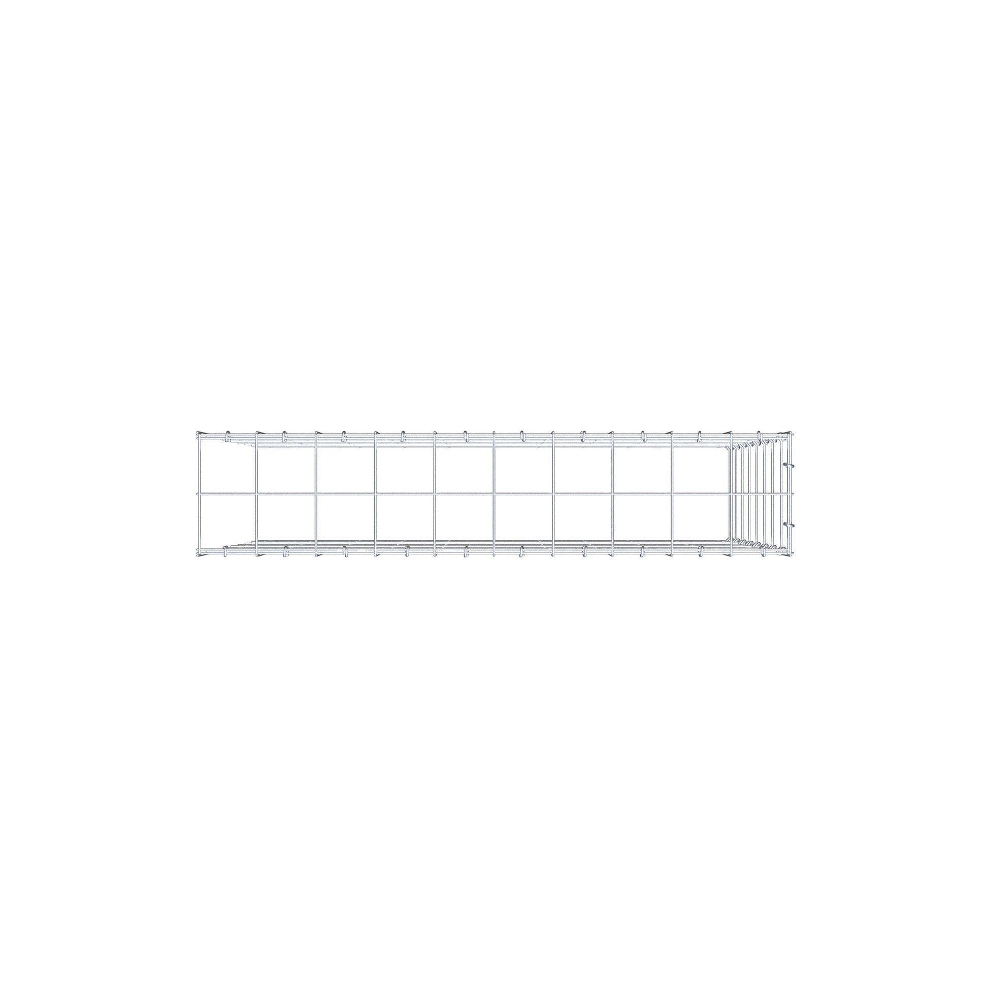 - Hinweis: kein eigenes Bodengitter und kein eigenes Stirngitter – die Verbindung erfolgt über das Deckelgitter und den Verschluss der unteren Gabione sowie den Verschluss der seitlichen Gabione.