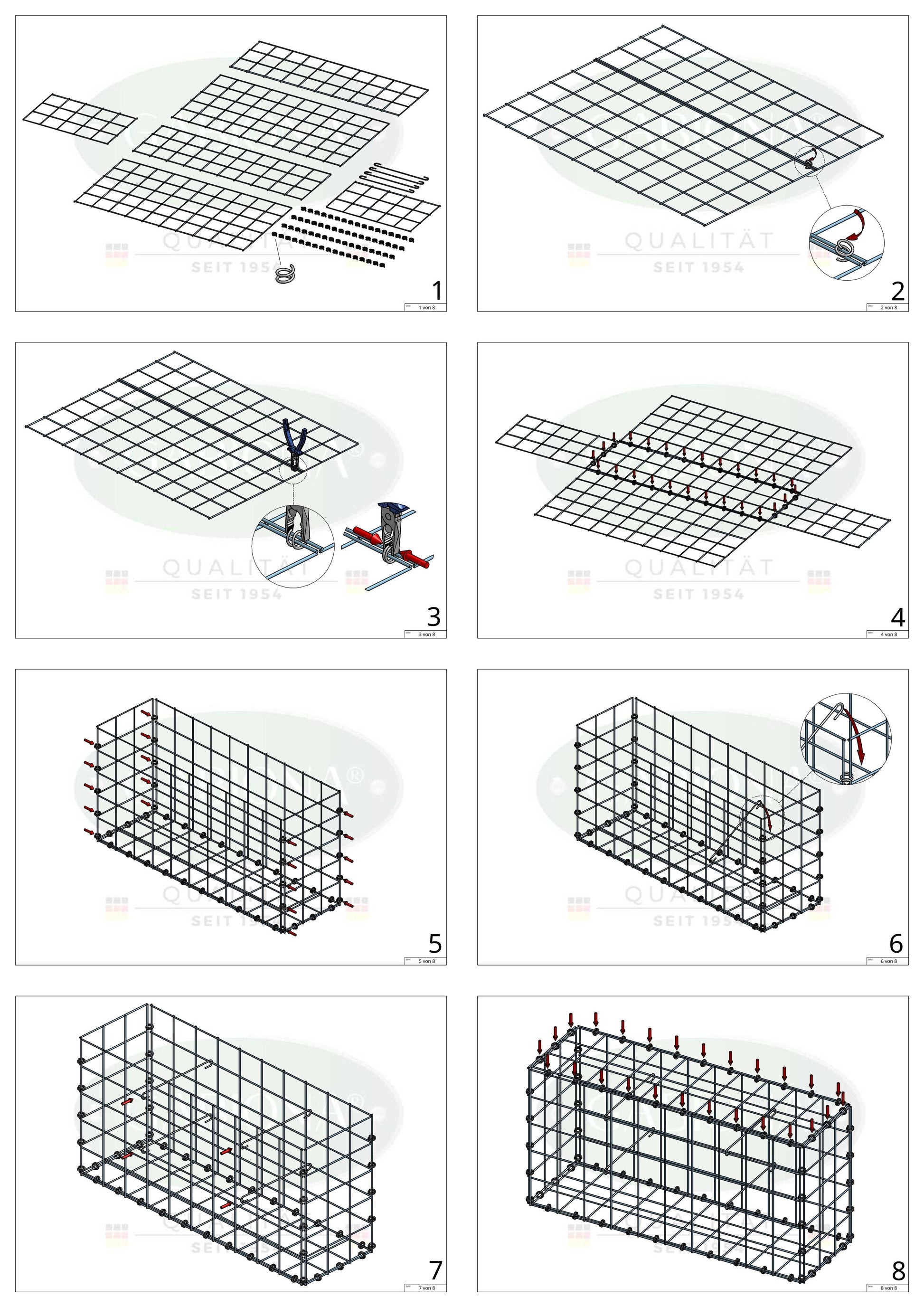 Diese robuste Gabione wurde speziell für höchste Ansprüche an Stabilität, Langlebigkeit und Witterungsbeständigkeit entwickelt. Die Konstruktion wird mit mehreren Spiralringen sicher verschlossen, die durch zwei Drähte gedreht und mithilfe einer Zange fixiert werden. Dies sorgt für eine einfache Montage und eine besonders stabile Verbindung der Gitter.